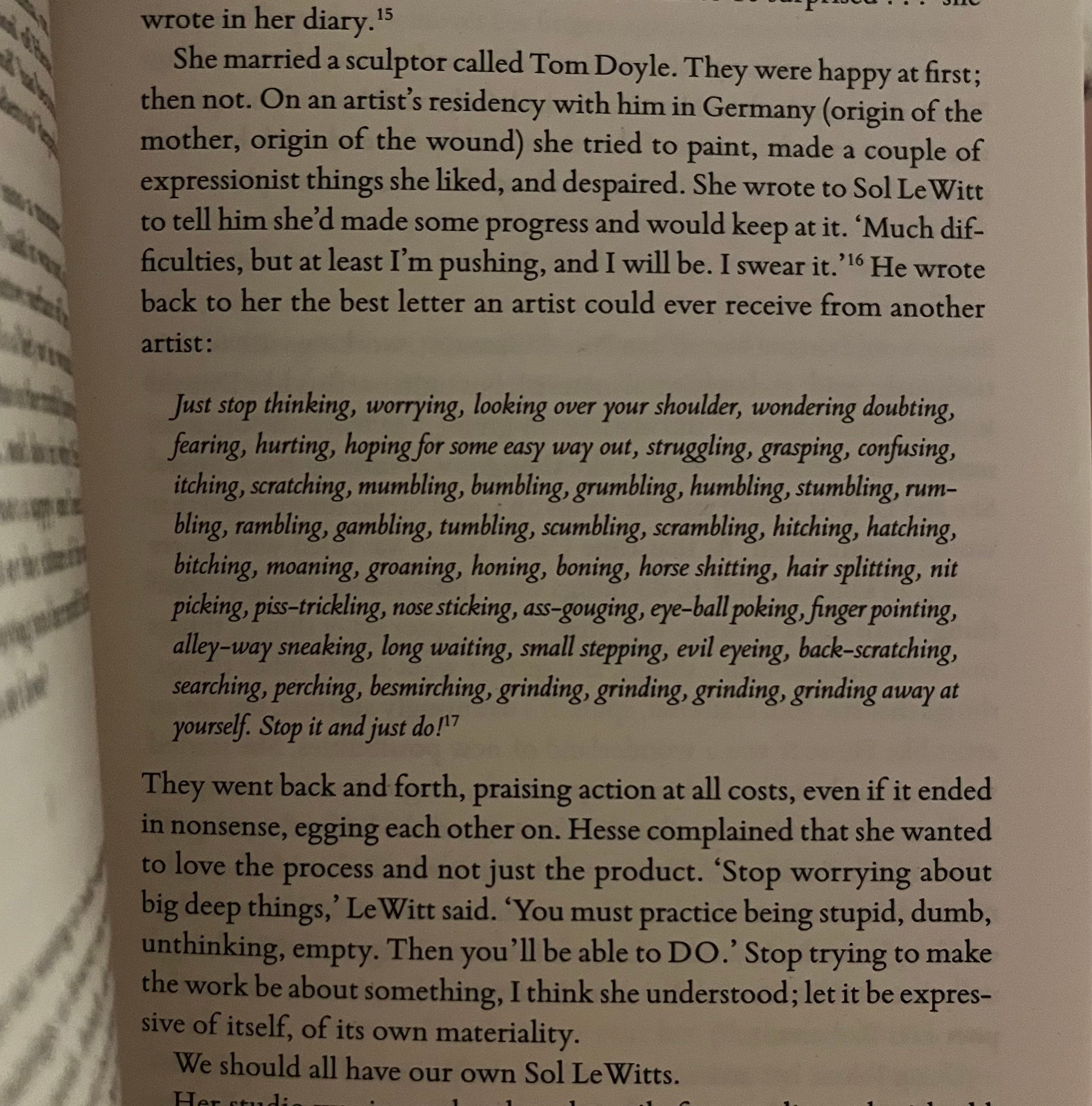 I’m writing this as I finish the last chapter of Art Monsters by Lauren Elkin. Towards the end of the book, she explores Eva Hesse’s art, and how, during a period of creative block, her good friend, fellow artist Sol LeWitt gave her advice about letting go of perfectionism and self-consciousness: “You must practice being stupid, dumb, unthinking, empty. Then you will be able to DO.“ Here is the full part in the book: